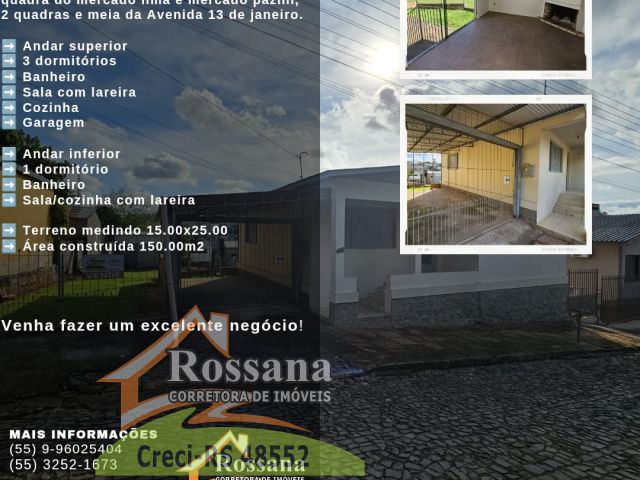 Excelente Casa a VENDA!! 》Localizada na Rua Maurício Cardoso, a uma quadra do Mercado Lima e Mercado Pazini, 2 quadras e meia da Av. 13 de Janeiro. 》Terreno medindo 15.00 X 25.00 》Área construída de aproximadamente 150.00m2 》Casa com 2 pisos 》Andar superior: 》Com 3 dormitórios 》 banheiro 》Sala com lareira 》Cozinha 》Garagem 》Andar inferior: 》1 dormitório 》Banheiro 》Sala/cozinha com Lareira. Agende uma visita e venha fazer um excelente negócio!!! (55) 9-96025404