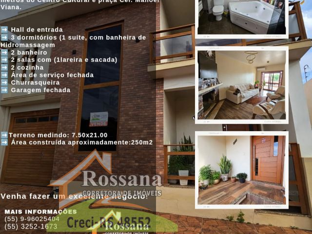 Excelente Casa a VENDA!! 》Localizada na Rua Gabriel Machado, pouco metros do Centro Cultural e Praça Cel. Manoel Viana Hall de entrada 2 salas (1 com Lareira e sacada) 2 cozinhas 3 dormitórios (1 suíte com banheira de hidromassagem) 2 banheiros Área de serviço fechada Churrasqueira Garagem fechada Terreno medindo: 7.50x21.00 Área construida aproximadamente: 250m2 Venha agendar uma visita e fazer um excelente negócio!! (55) 9-96025404